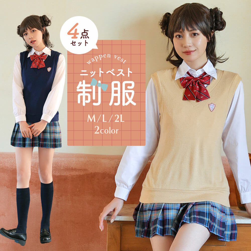 ベスト×ブルーチェックスカート長袖制服セット 3000ポイント 2024.06.26 学園気分を味わうならこちらの制服セットがおすすめ! 赤のスクールリボン、校章風のワッペンがついたベストと長袖シャツ、ブルーチェックの爽やかなスカートで完璧なコーディネートを♪