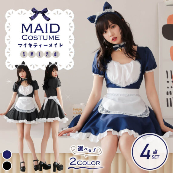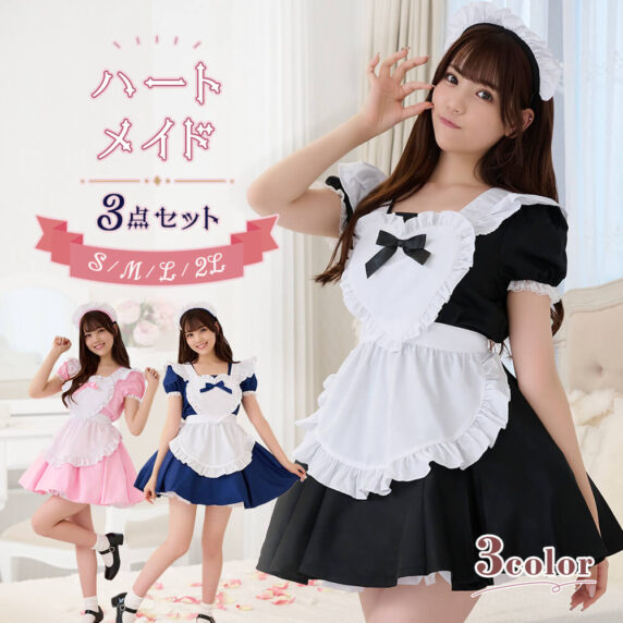 プチリボンがついたハート型のエプロンがキュートなメイドコスチューム。フリルたっぷりなデザインとパフス...